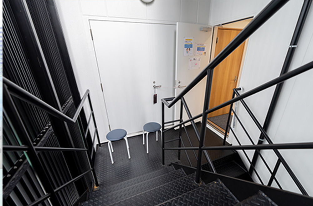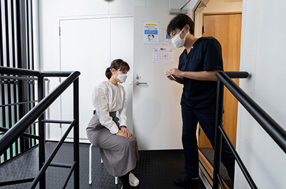 階段の踊り場で検査いたします。