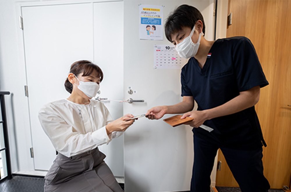 受付で問診表などをお渡しいたしますのでご記入をお願いします。